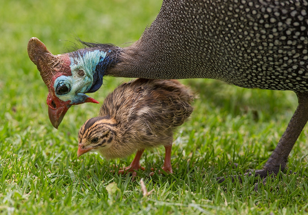 Helmeted Guineafowl with chick