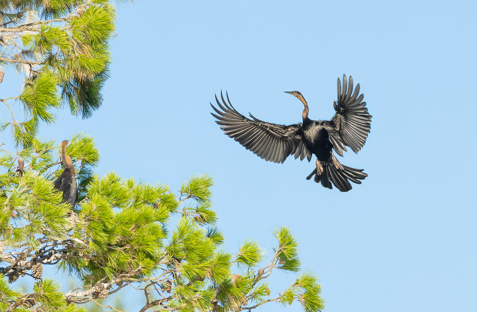 African Darter (Anhinga rufa) arriving at its nest.